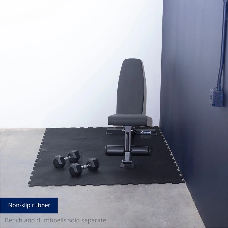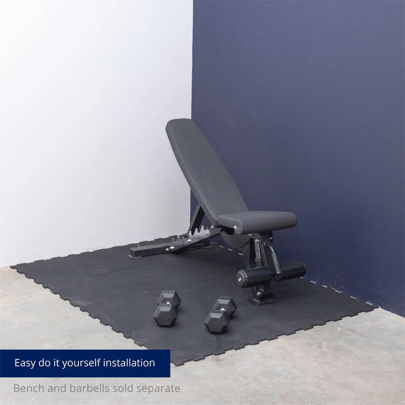 Engineered to reduce noise, vibration, and impact, the Interlocking Tile Flooring will take your home gym to the next level. Each pack contains twelve, 10 mm thick, impact-resistant center rubber tiles to support any workout and fitness equipment style. Easy to install, the puzzle-style edges fit together smoothly and securely, only needing a sharp utility knife and straight edge to cut. The seams appear nearly invisible once connected. The tiles are safe to use indoors and out and can be laid loose, saving you from applying adhesive during installation. Additionally, these non-slip rubber tiles can create custom mats for weight rooms, basements, ski lodge flooring, and more.