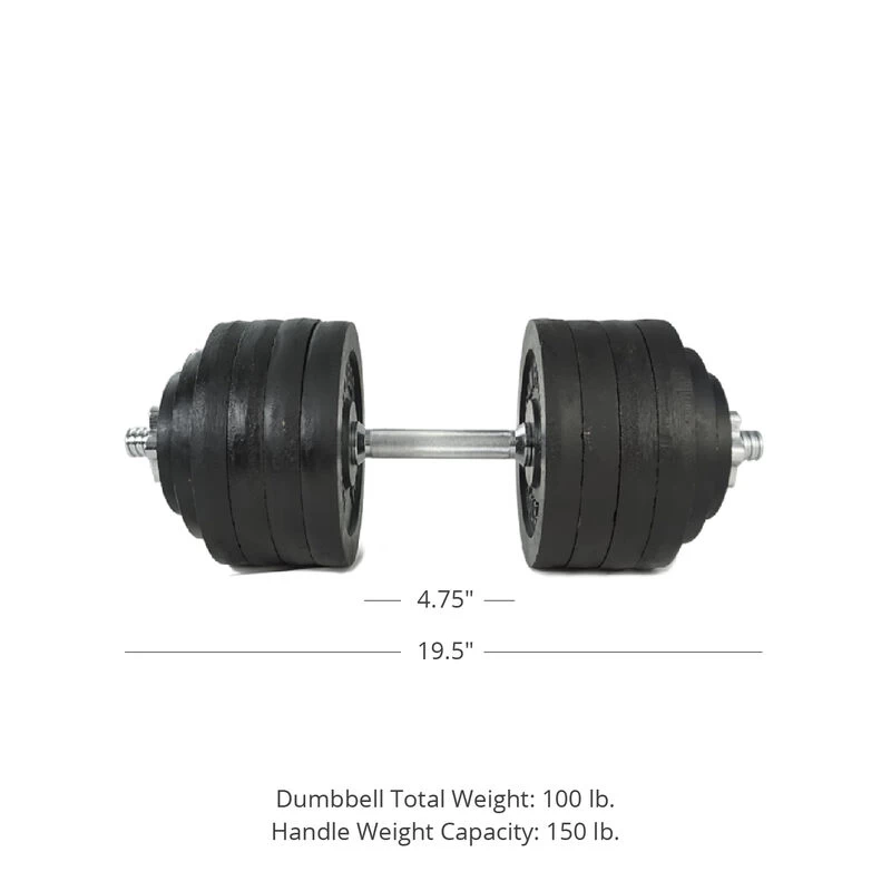 The Powder-Coated Cast-Iron Adjustable Dumbbells offer multiple weight options from 5-pounds to 100-pounds. The set includes two 19.5-inch Adjustable Thread Dumbbell Handles with Lock Collars that features a 25mm diameter center with knurled competition texture for a comfortable and firm grip that holds up to use and weather. The durable weight plates come in 2.5, 5, and 10-pound increments that feature the weight and TITAN branding. The weight plates allow you to dial in the exact weight you need for training. With these dumbbells, you can do a range of exercises that target your biceps and triceps, abs, delts, traps, back muscles, etc.