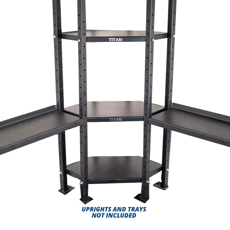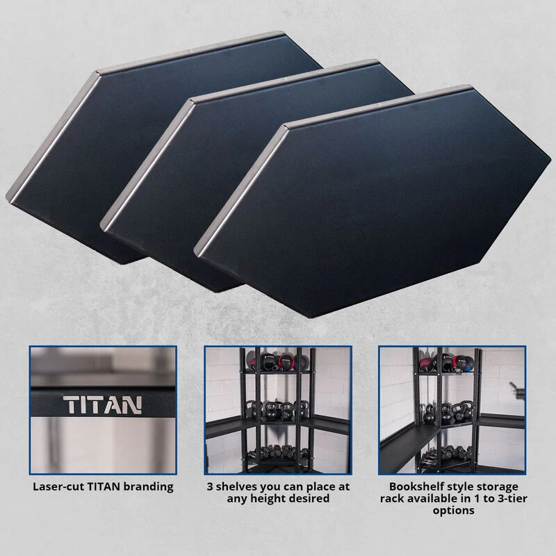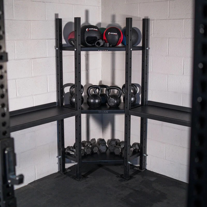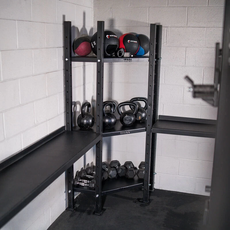 The Mass Storage Corner Shelves by Titan Fitness® are available in 1, 2, or 3-Tiered options and are designed to take advantage of useful corner space. This bookshelf-style storage rack helps make use of “dead zone” corners or can wrap-around a protruding wall. Constructed from 2 x 2-inch, 11-Gauge Steel, these corner storage shelves can hold up to 192-pounds per shelf. Swap out dumbbells, kettlebells, weight balls, and more.