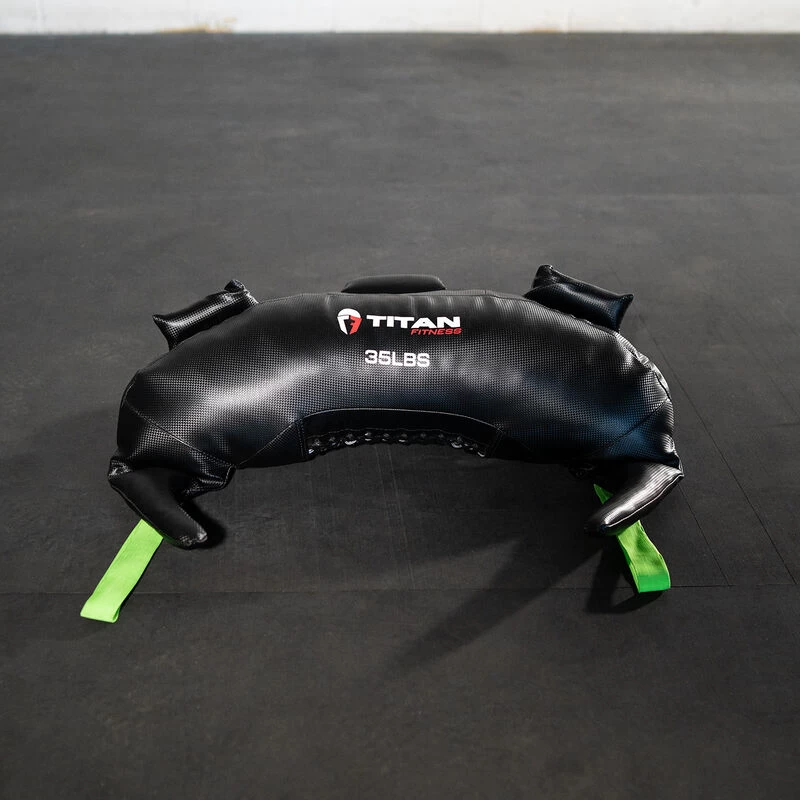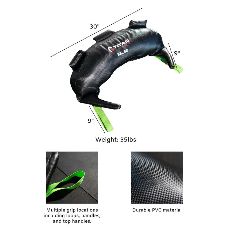 Add a whole new dynamic to your workout routine with the multi-faceted Functional Training Swing Bags by Titan Fitness®. These extremely handy training bags can be swung, carried, lifted, tossed, and more! Featuring two main straps for simpler exercises, or take your grip strength to the next level with the challenging top handles. The swing bags are 30-inches in length, a great size to fit athletes both large and small. They are offered in a variety of weights from 15 to 60-pounds to suit your training needs. For those looking to shake up on their aerobic and cardio routine, the smaller bags may be the best fit. More serious competitors, who are looking to make serious strength gains and maximize their weightlifting, may lean towards the heavier-weight swing bags. The handles on either side measure about 9-inches in length – which is also the length of the color straps.