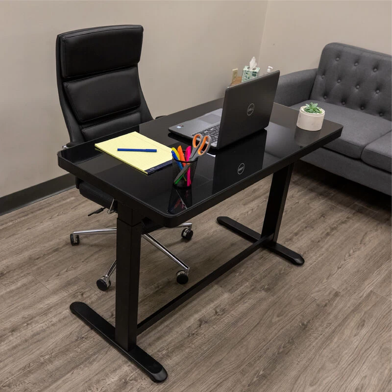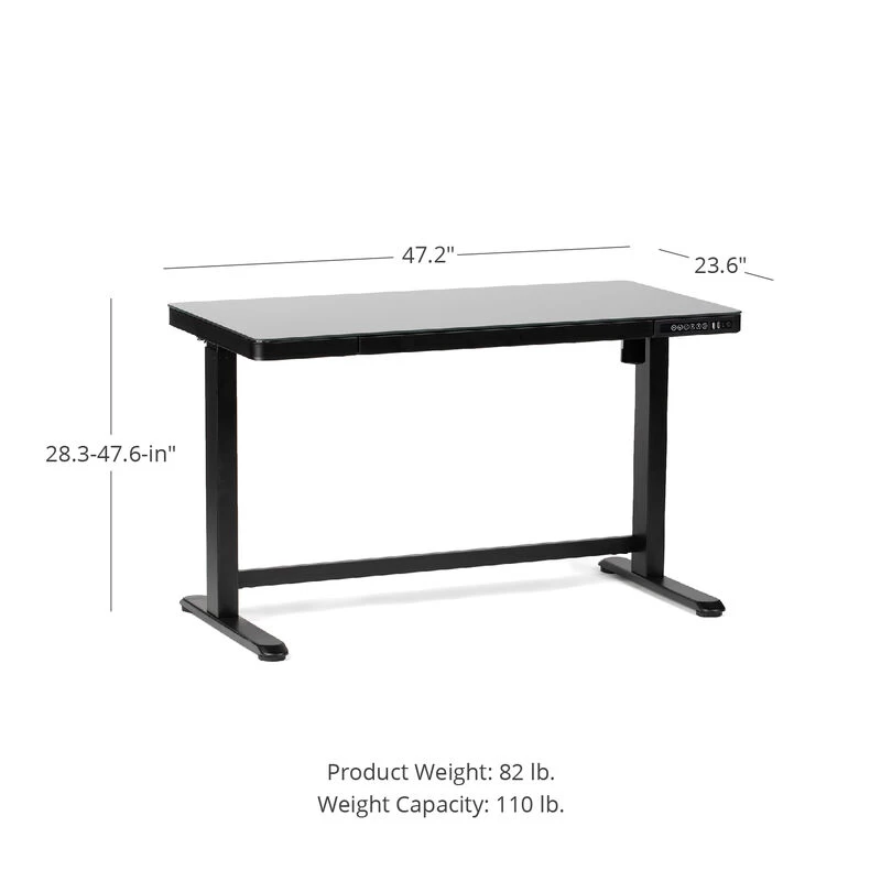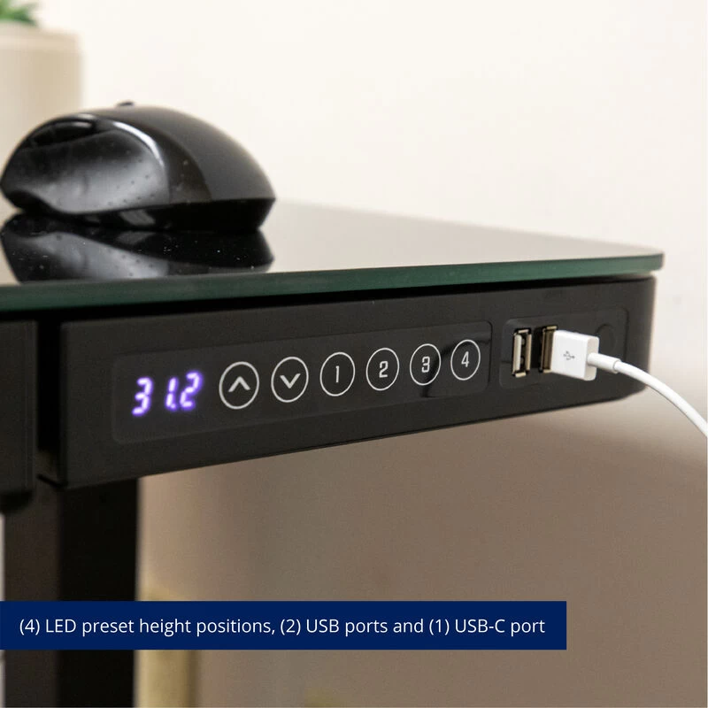 Create your ideal home office environment with the Adjustable Electric Glass Top Standing Desk. It features a control pad with (4) memory pre-settings, a safety lock, and (3) charging ports. The desk has a big drawer and plenty of desk space. Whether you are working at home or just for family use, there is plenty of room for your setup.