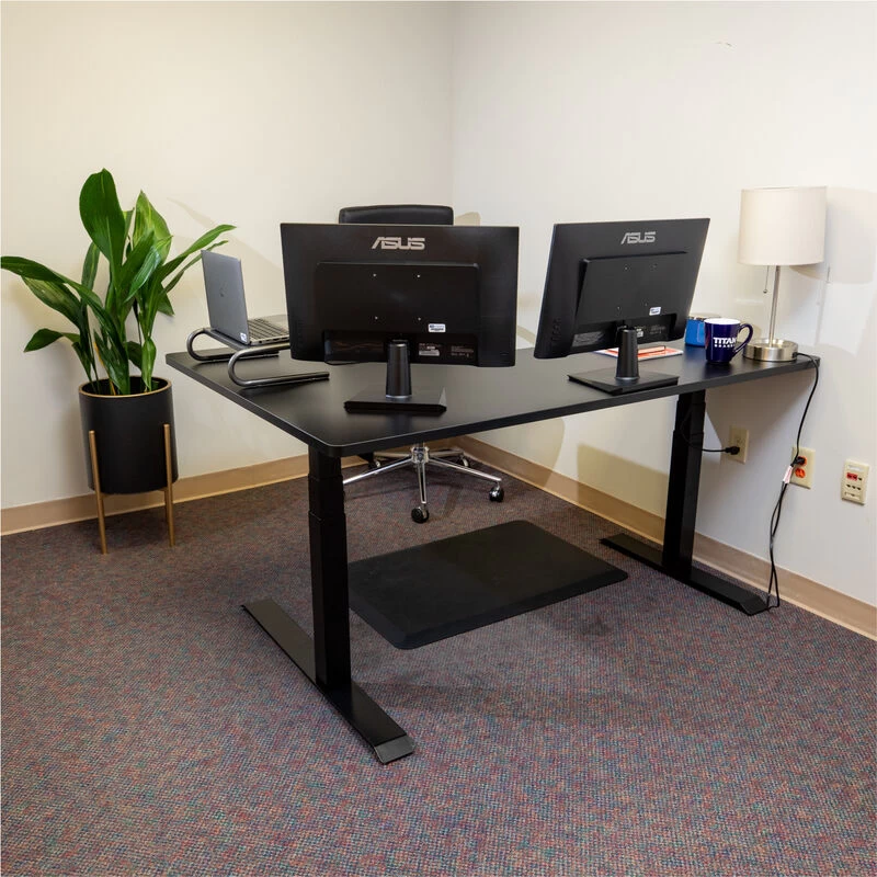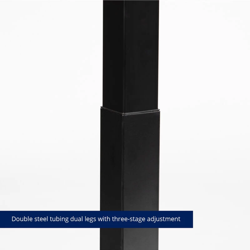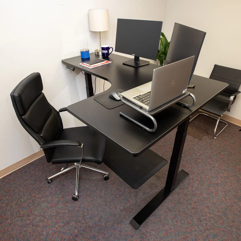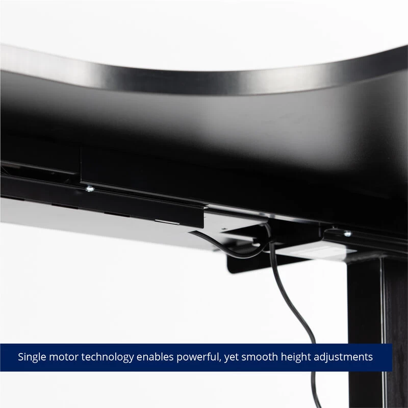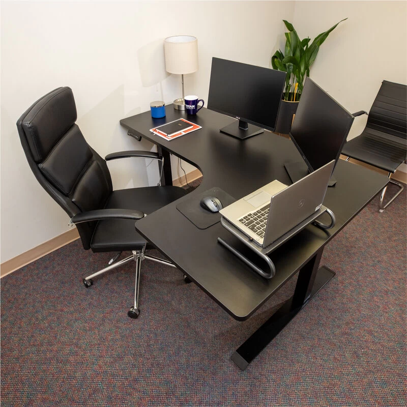 The Adjustable L-Shape Corner Standing Desk is a height-adjustable Sit-Stand Desk that elevates from 23-inches to 48-inches at the touch of a button. Composed from durable steel, the frame combined with a solid 1-inch-thick black laminate desktop allows for a 210-pound weight capacity to support your ideal workspace at its highest elevation. The large work surface measures 63 x 23.5-inches on the long side and 43.25 x 23.5-inches on the short side. Providing ample space for multiple monitors, picture frames, books, and more. This single motor lift mechanism offers a smooth height adjustment and anti-collision sensor that ensures it lifts and lowers smoothly, quickly, quietly, and safely.