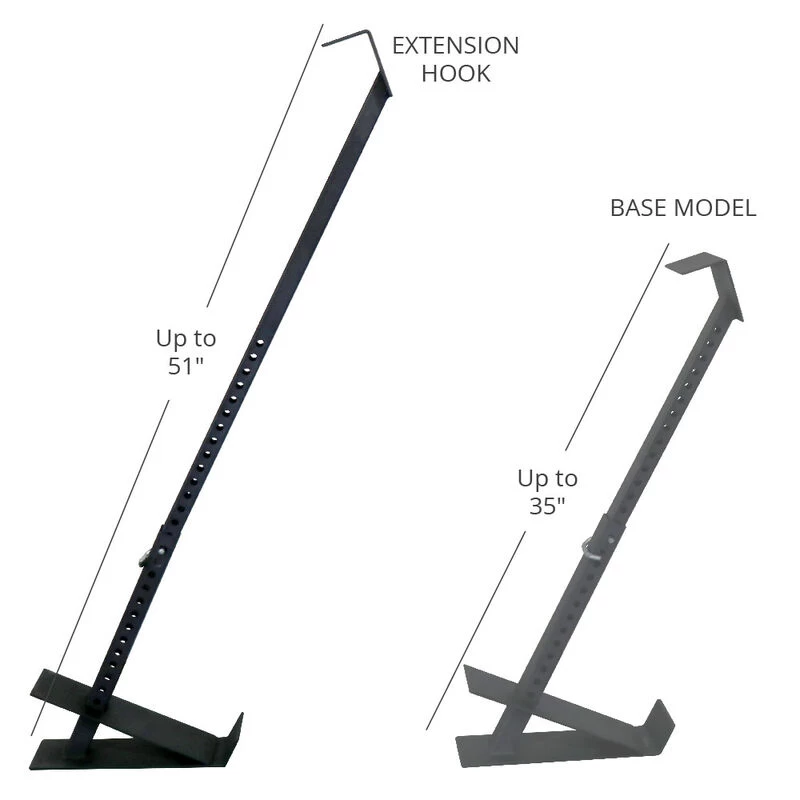 Eliminate the need for a spotter and focus on the eccentric phase of your lifts with these Eccentric Hooks. The Eccentric Hook Extensions extend up to 51″ versus the base model, which extends to 35″. Simply remove the short extension from the Eccentric Hooks and replace them with the expanded attachment. Then attach the hooks to the end of your barbell to front-load your first rep with extra weight on the “negative” portion of your lift, and let the hooks drop off, leaving you with just the weight on the bar for the remainder of your set. As you reach the bottom range of movement and the angled footplates touch the ground, the hooks will release from the barbell, enabling an explosive lift.