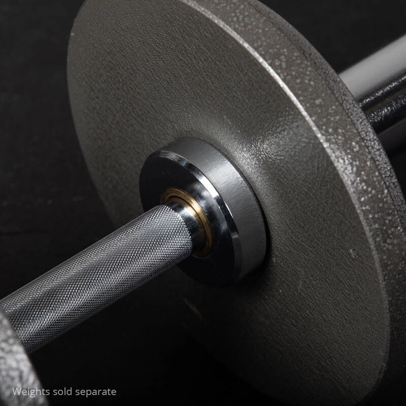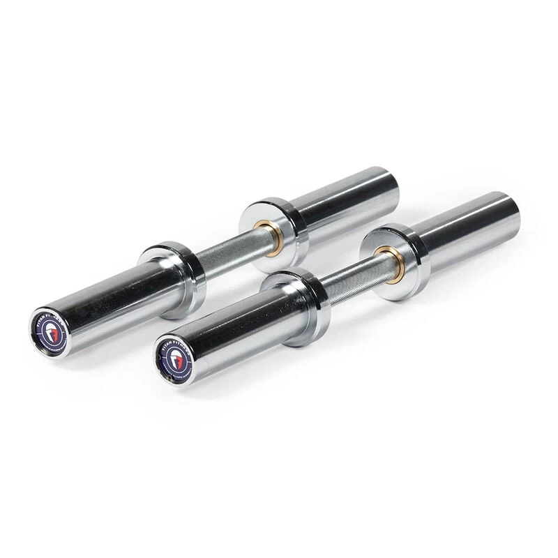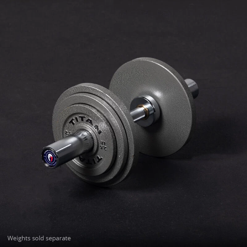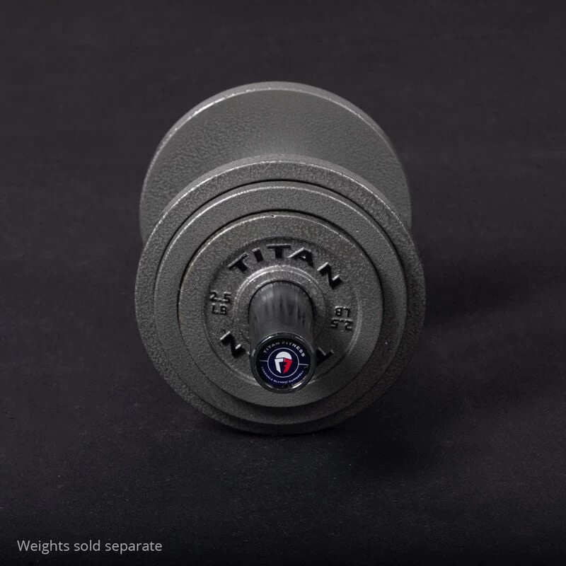 Unleash your inner Titan with the Loadable Dumbbell Handle, part of our exclusive adjustable dumbbell selection for space efficiency. This commercial-grade dumbbell handle was inspired by Olympic barbells featuring a loadable sleeve length of 6.5-inches. All versions of the Olympic Dumbbell Handle are constructed from high-quality rust-resistant steel with medium diamond textured knurling and bronze bushings. Incorporate the handles while performing lunges and squats in your fitness routine to target your hamstrings, quads, and glutes. You can even target your obliques by doing side bends and twists. They truly offer a total body workout.