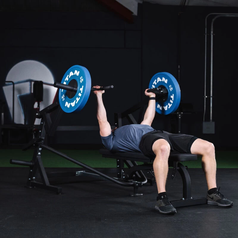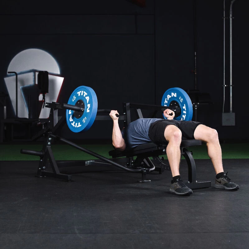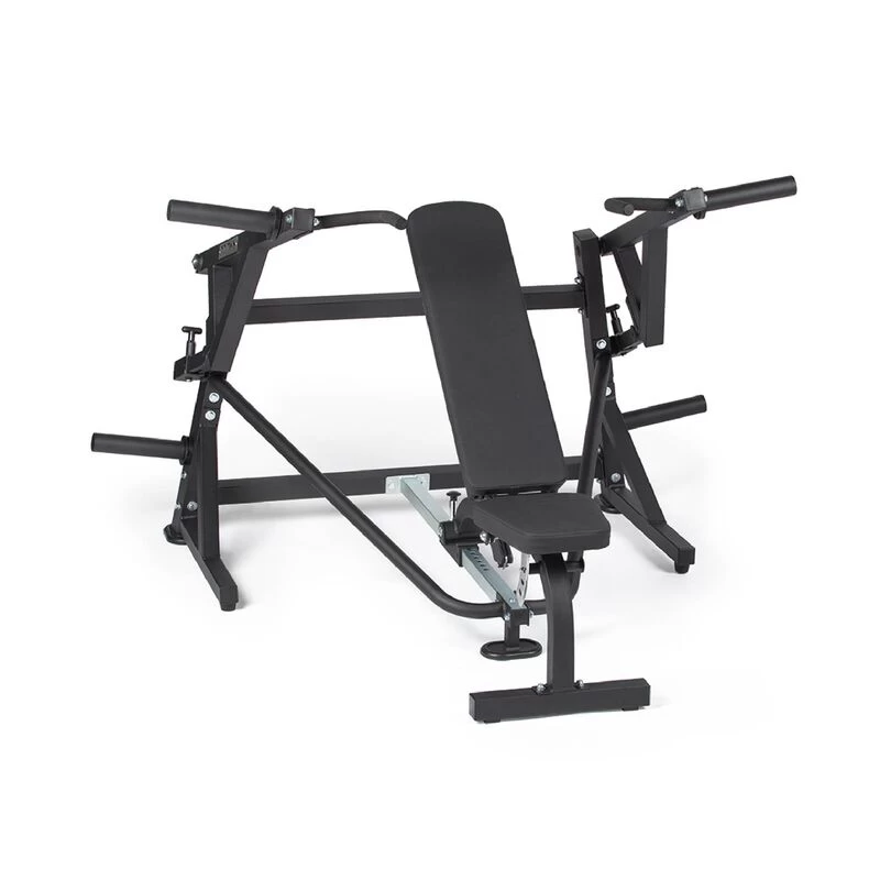 The Plate Loaded Chest Press Machine is constructed for home and garage gym athletes that may need a safety catch while lifting alone. Built out as a fully functional upper body multi-press that allows the user to feel the same range of motion as free weights. Each arm is independent of the other, allowing for various weight levels on each arm or stack the weights for a balanced development of your upper body. The specialty machine includes an adjustable FID bench with several incline and decline positions. Lay the bench flat to develop pectoral or chest muscles. Adjust the seat at an incline to put less strain on your rotator cuff and activate your deltoids. Or position the bench at a decline and rep through an abdominal routine.