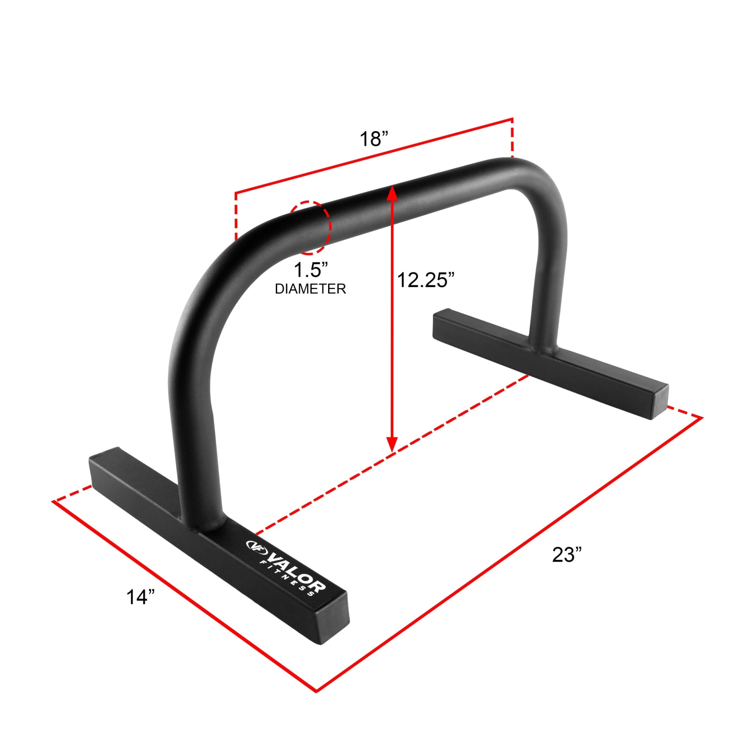 - LIGHTWEIGHT AND PORTABLE: Bring these space-sufficient handles to the gym or use them in the comfort of your own home gym! Each of these parallette bars (2) measures 23″ x 14″ x 12.25″ (bottom of the bars measures 10.75″ off the ground), with a combined weight of 14 lb.