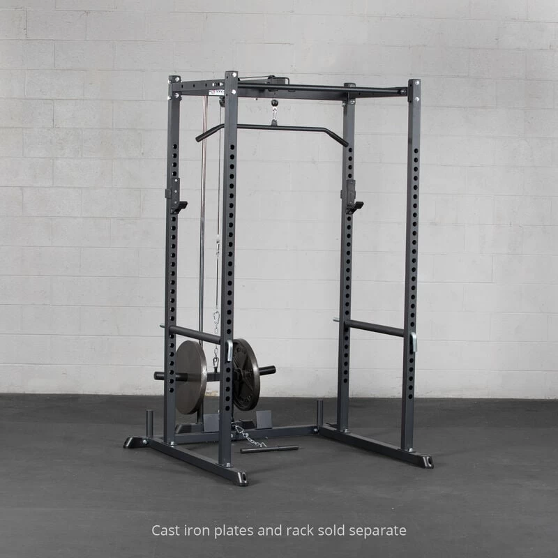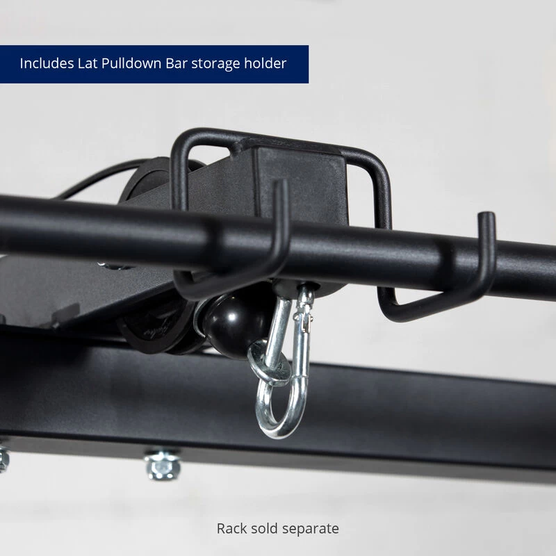 Turn your T-2 Series Power Rack into a powerful Lat Tower with the Lat Tower Attachment. This space savings pulley system is designed to deliver the same training benefits of a traditional Lat Pulldown Machine with the perk of a Low Row attachment to target your arms and back – building your biceps, rhomboids, and trapezius muscles altogether. Both Lat Pulldown and Low Row handles are included with our Lat Tower Attachment, but weight plates must be purchased separately. The bolt-together installation ensures this attachment is securely fitted within your T-2 Series Power Rack. If you want to make your garage gym bigger, bolder, and badder – look no further than this powerful lat tower attachment.