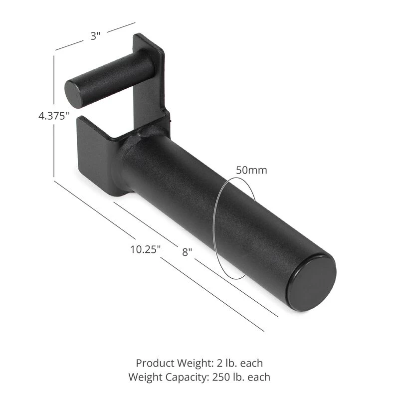 Sold in a set of four, the T-2 Series Weight Plate Holders are the perfect solution to storing your weight plates. Designed with a J-hook style mounting system that allows you to install the hooks to your rack within seconds. Easily clip the mounting system into the uprights by inserting the pin and twisting the bars down. No hardware required. The 50 mm diameter sleeves fit Olympic weight plates and have a loadable sleeve length of 8-inches to fit multiple plates.