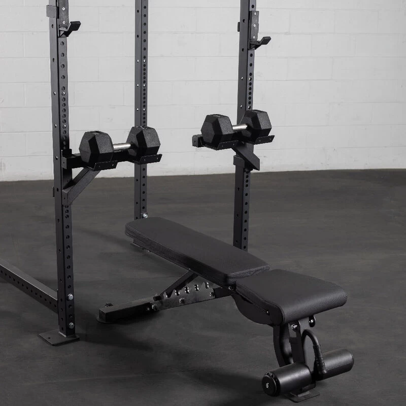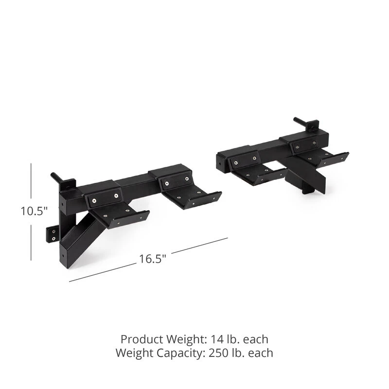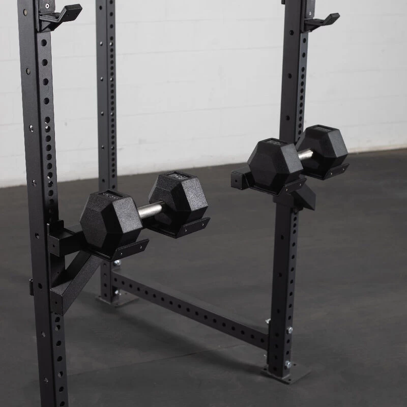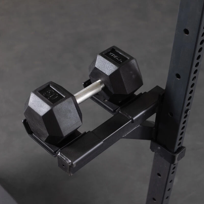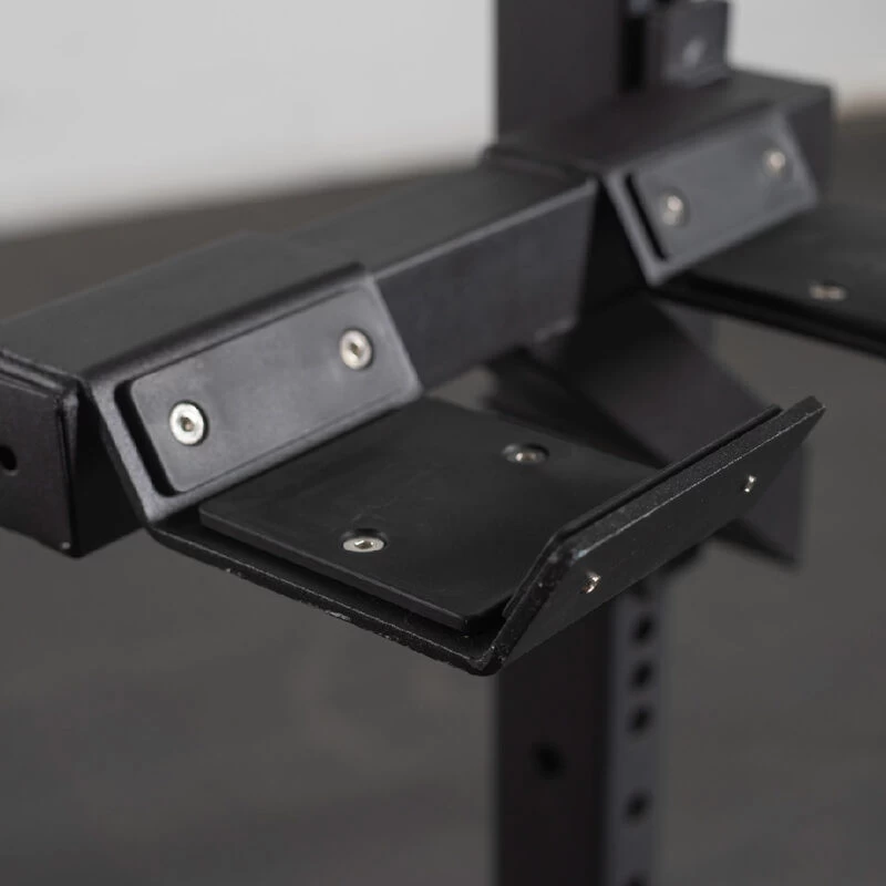 The T-3 Series Dumbbell Weight Bar Holders allow you to place one pair of dumbbells on either side of your T-3 Series Uprights in order to conveniently and safely perform free-motion dumbbell lifts. Designed with a J-hook style mounting system that allows you to install the bars to your rack within seconds. Easily clip the mounting system into the uprights by inserting the pin and rotating the holders down. No hardware required. The safety spotters can hold up to a combined 500-pounds and are a great asset when transitioning between sets and exercises. Lock them to your desired height and get to lifting!