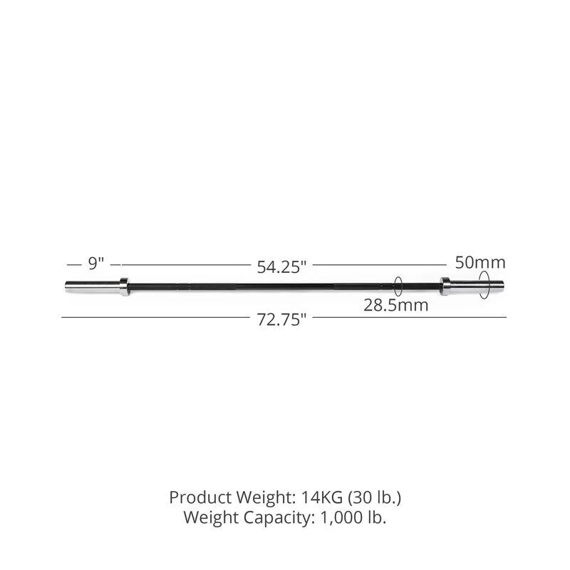 Unleash your inner Titan with the TITAN Series Shorty Olympic Barbell, part of our exclusive selection of barbells made in the USA and constructed from hand-selected virgin, non-recycled American Steel. This top-of-the-line multipurpose barbell weighs 14 KG (30 LB). It features dual knurl marks, medium-diamond textured knurling, and a black zinc shaft with hard chrome-coated sleeves. The sleeves are 9″ long, reducing the weight load. Suitable for Olympic weightlifting and powerlifting, this balanced hybrid bar provides 145,000 PSI tensile strength for the right amount of whip or flex for fluid movement through your lift. Smash your daily workouts and hit your PR with this top-rated bar.