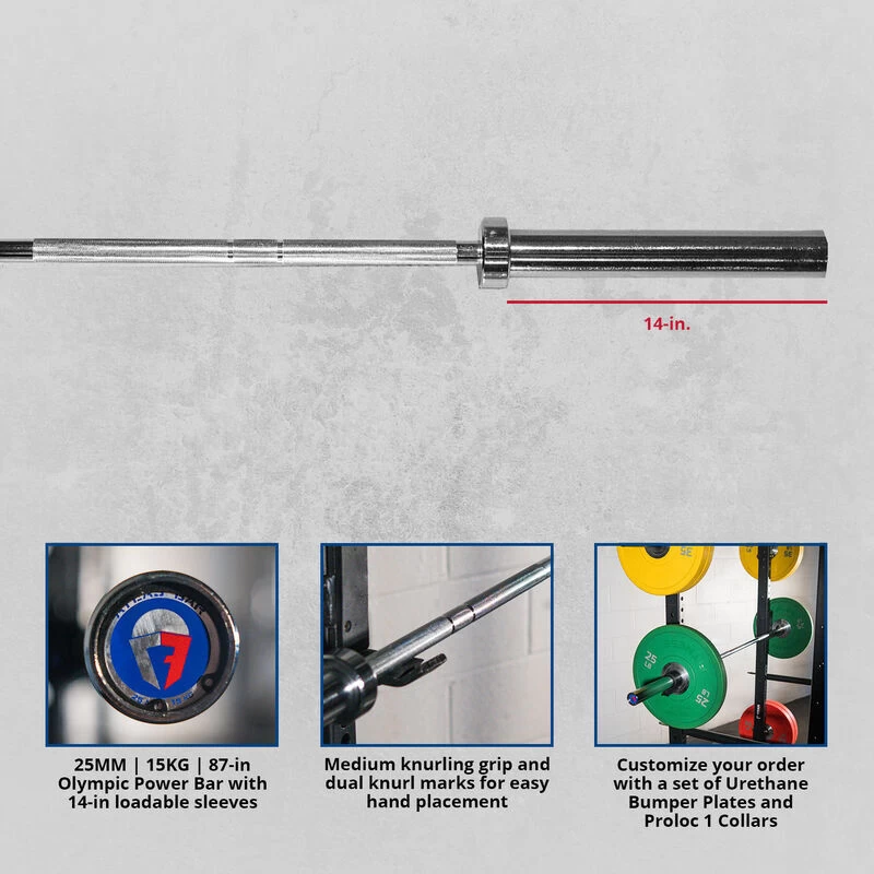 QUALITY CONSTRUCTION: The 15KG Atlas Bar features a Chrome, 25MM shaft with a tensile strength of 220,000 PSI. The friction-welded sleeves have a chrome finish with bronze bushing and 10-needle bearings, with 14-in of loadable sleeve length and standard Olympic knurl marks.